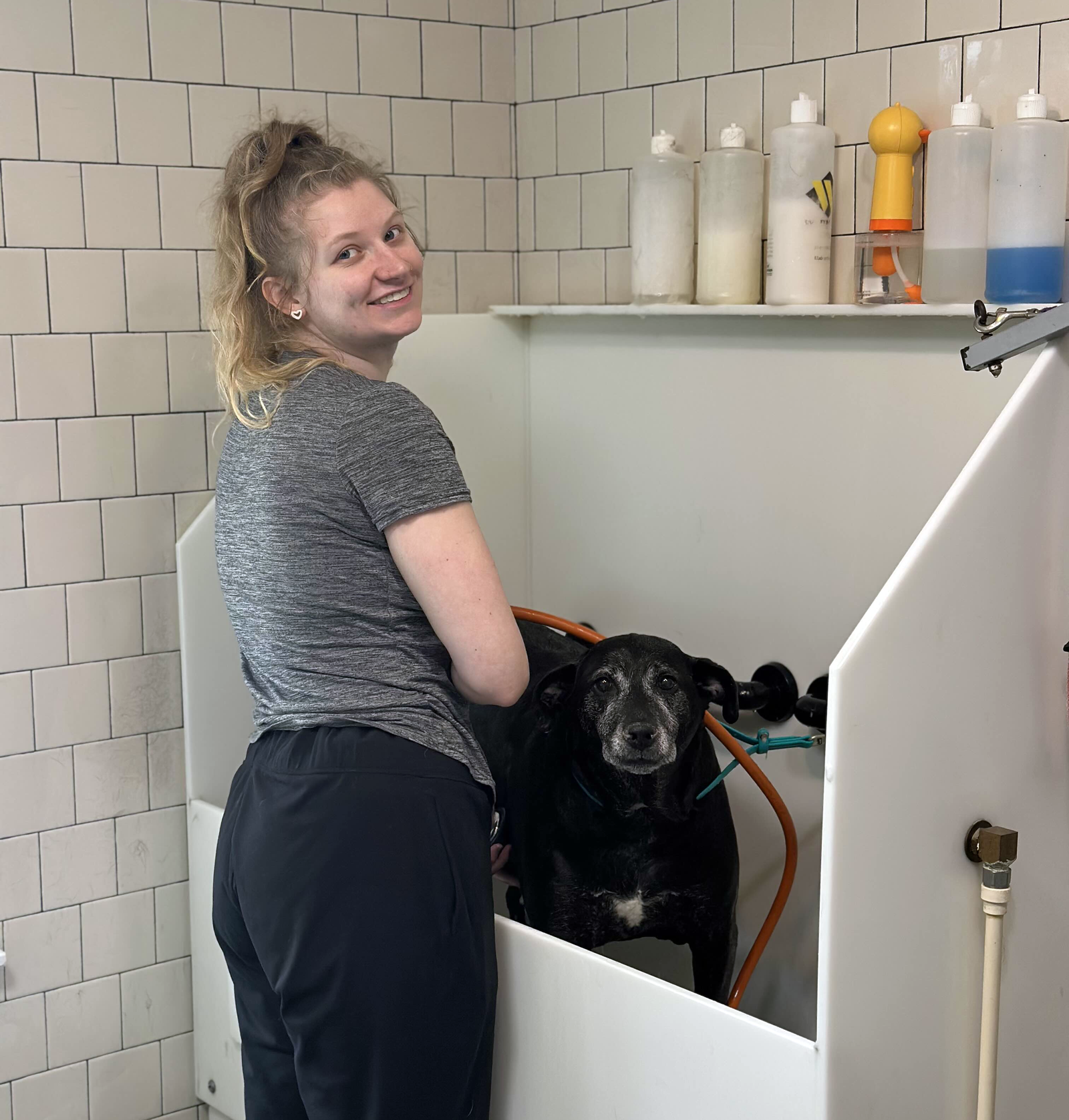 The process begins with a specialized de-shedding shampoo to thoroughly cleanse the skin and coat. This is followed by a rich, conditioning treatment that is massaged in to deeply nourish the skin and hydrate the coat. A high-velocity dryer is then used to safely remove loose, dead hair. After the bath and final blow-dry, professional tools, including the Furminator and other deshedding implements are used to gently remove remaining undercoat.